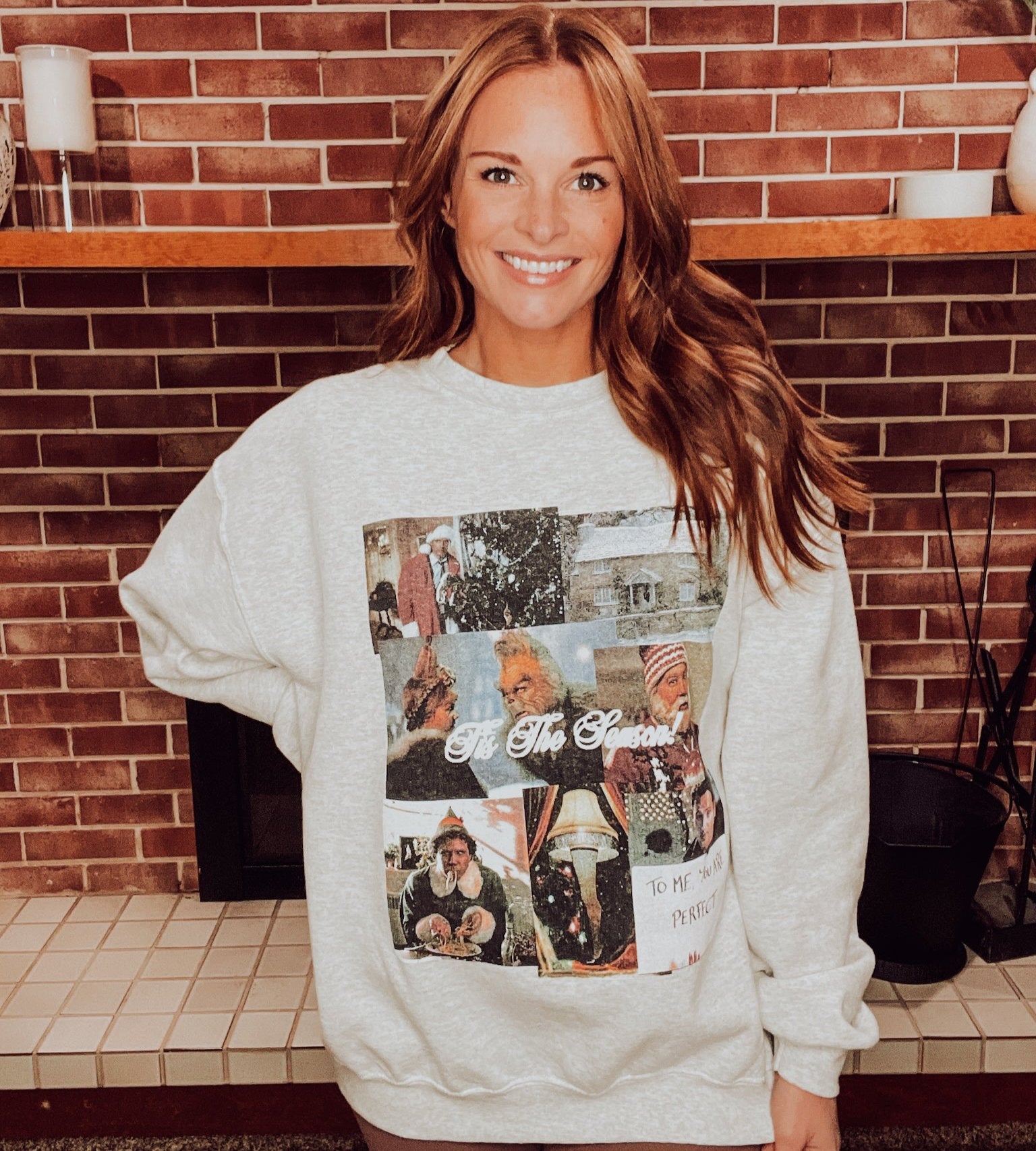 Tis the season for binging all your favorite holiday movies, blasting your go to holiday jams, baking in the kitchen and making magical memories. This ash grey crewneck features screengrabs from all your favorites like The Grinch, Elf and A Christmas Story.