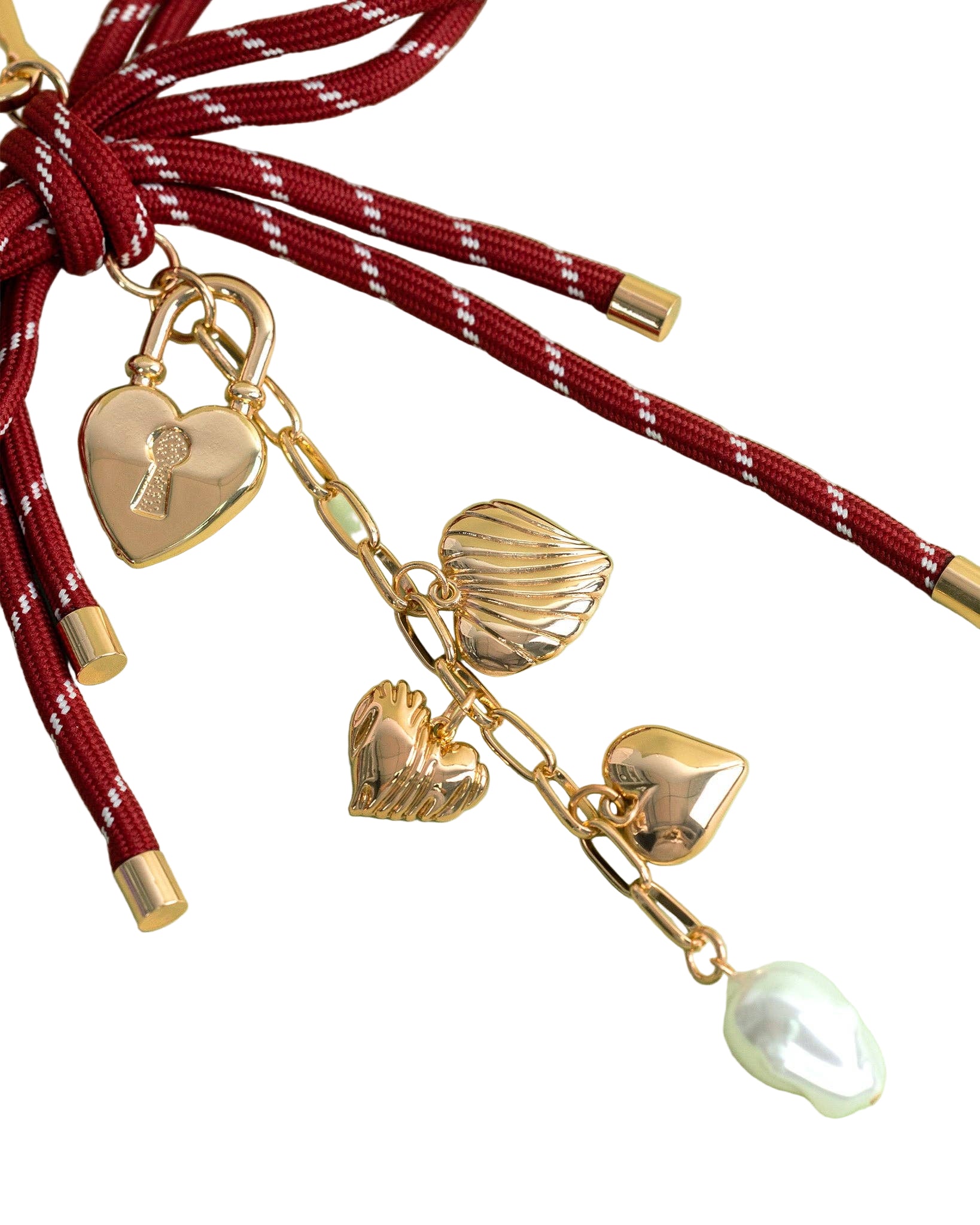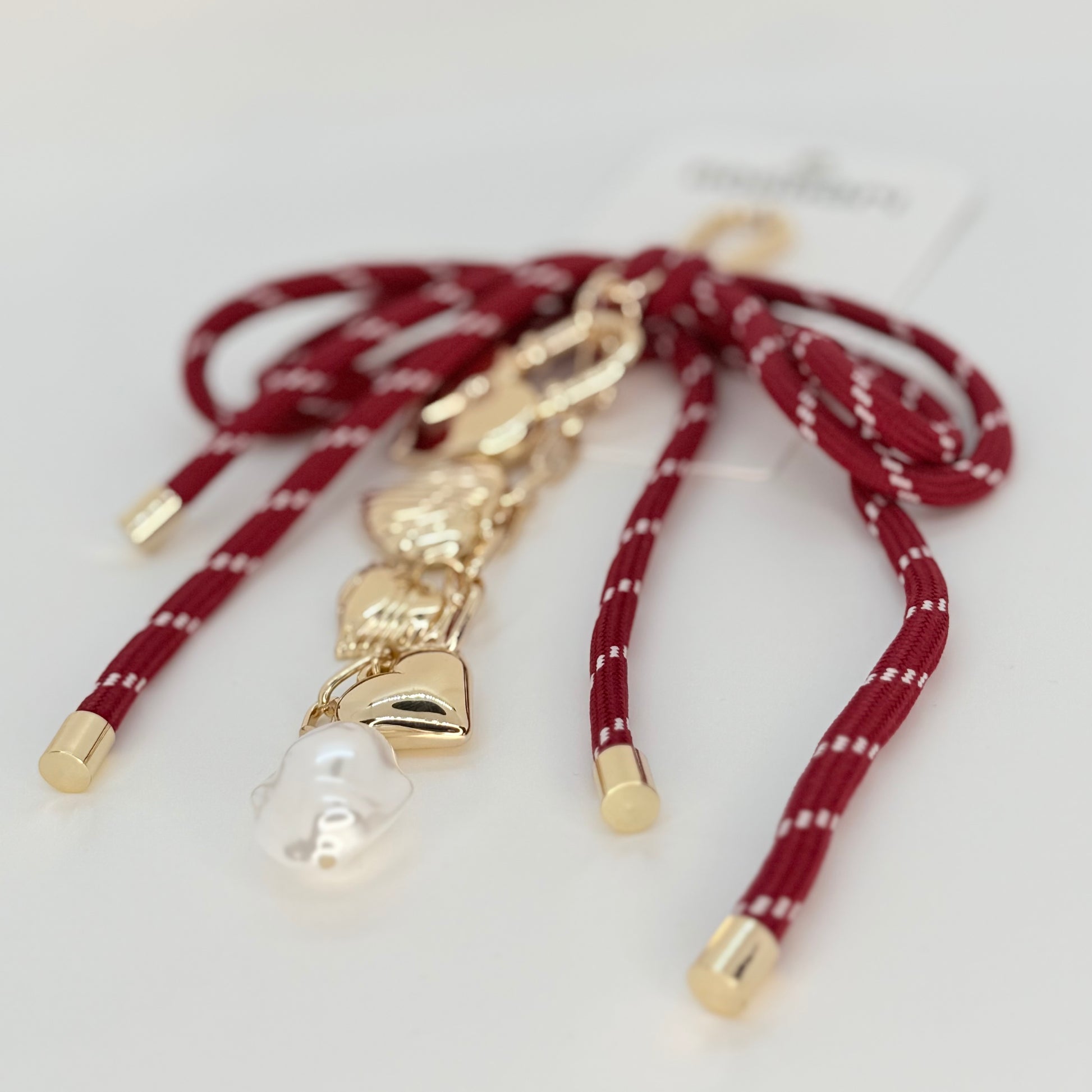 This charm weaves a maroon bow with gleaming gold hearts. The mix of soft curves and heavy metal details turns mismatched textures into a miniature masterpiece, ready to make any bag or keyring unforgettable.